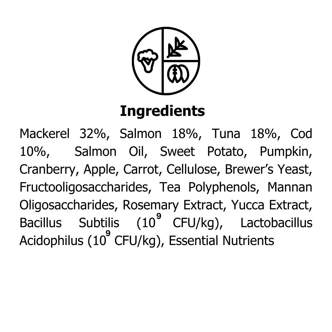 3) Holistic Health from the Sea: These powerful ingredients not only support strong muscles and a lustrous coat but also promote robust joint health, sharp cognitive function, and a resilient immune system.